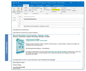 SuccessControl CRM erleichtert Ihnen durch die Verwendung von Textbausteinen bereits erheblich die Arbeit. Perfektioniert wird dies durch die Nutzung beziehungsweise Ergänzung um die sogenannten Outlook Schnellbausteine.