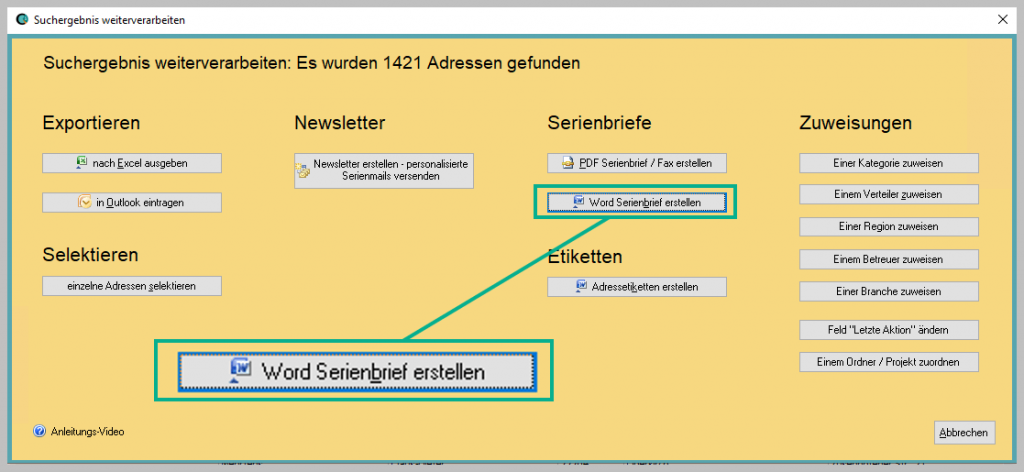 Sie wählen lediglich die die gewünschten Adressaten aus der Adress- und Kundenverwaltung aus – auch als Adressenselektion bzw. Kundenselektion bezeichnet. Die Software bereitet für Sie alle für den Seriendruck benötigten Daten inklusive zusammengesetzten Anschriftenfeld und Anredefeld für den Seriendruck mit Word auf. Besonders das bereits zusammengesetzte Anredefeld erspart Ihnen beim Seriendruck die sogenannten und komplizierten „wenn – dann“ Klauseln.