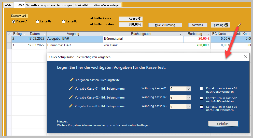 Das SuccessControl Rechnungsprogramm wird mit Kassenbuch ausgeliefert. Mit dem Kassenbuch führen Sie bis zu 3 Kassen – inklusive Quittungsdruck, PDF/Excel-Export und Rückgeldhilfe.